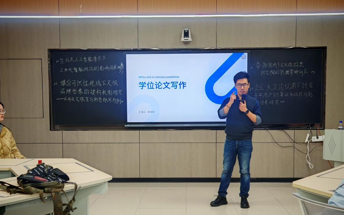 信息楼209智慧教室举行了一场关于学位论文写作经验的分享报告会,同院杜新宁博士作为协同嘉宾,助力学生应对论文各环节难题,降低校外盲审、抽查等环节的风险,让学生顺利地完成论文与答辩。