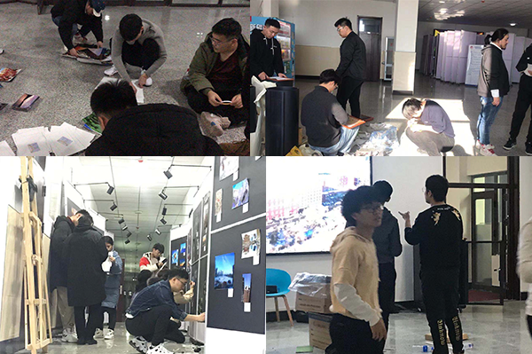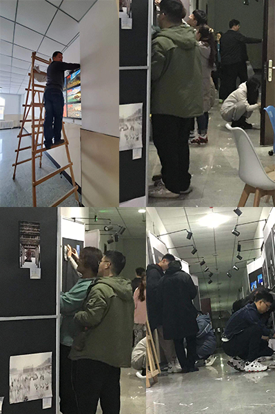 教师和学生忙碌的身影。教师带领学生共同参与劳动实践,用自己勤劳的双手布置“发现工大”摄影作品展的展厅。许许多多看不着的手工细腻活和劳力活,都是教师和学生们共同完成的。