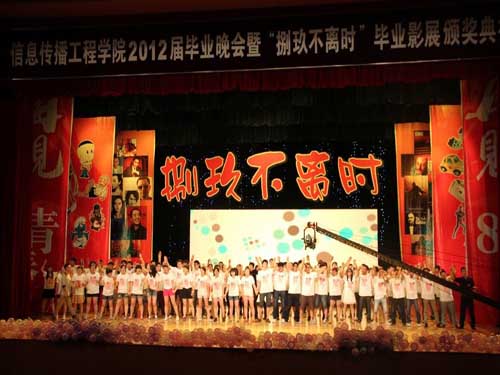 信息传播工程学院讯(通讯员 韩美华)又是一年毕业季,又是一年离别时。2012年6月20日晚6:30,信息传播工程学院在我校南湖校区大学生活动中心隆重举办2012届毕业晚会暨“捌玖不离时”毕业影展颁奖典礼。参加本次典礼的学校各部门领导有花都影视