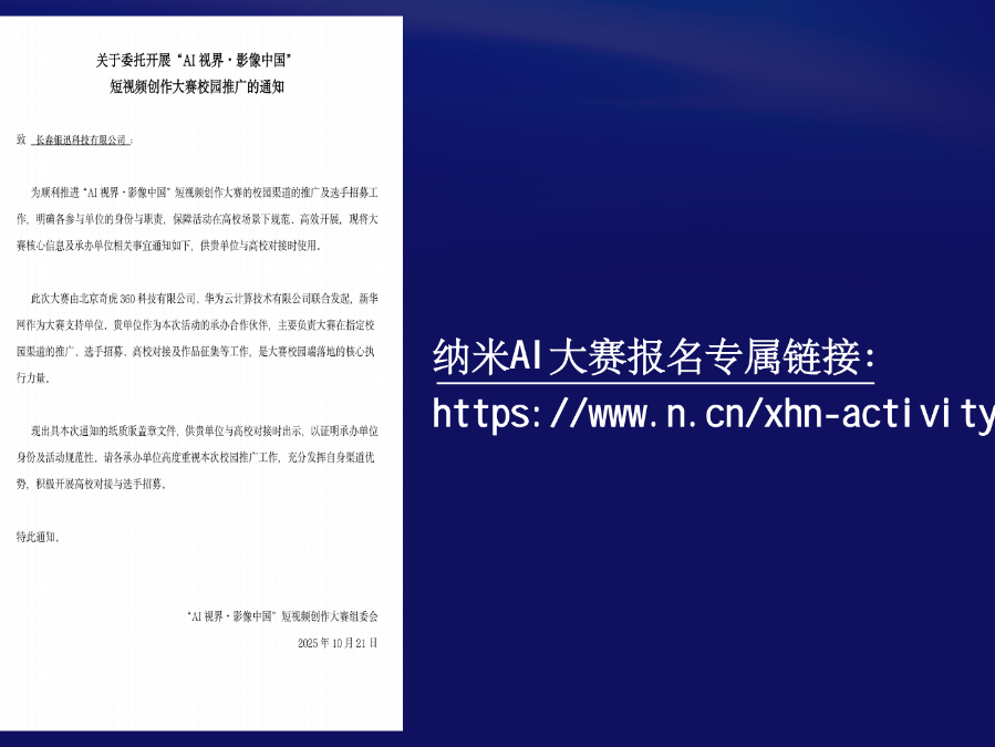 当AI的算法碰撞千年文脉,青年的创意邂逅影像艺术,360与华为云、新华网合作举办的“AI视界·影像中国”AI视频创作赛正在火热进行中!为推动产学研用结合,提升学生的数字素养,2025年11月6日花都影视
